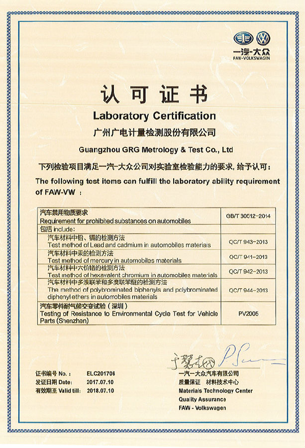 近日,一汽大眾汽車有限公司公布了最新的授權實驗室認可名單。經過資格審查、能力評估、現場測評等一系列嚴格的評比和考核,廣電計量通過現場審核成為一汽大眾授權檢測實驗室,獲得授權檢測服務的能力范圍包括汽車禁用物質、汽車零件耐氣候交變試驗檢測。今后,廣電計量將持續為一汽大眾及其供應商提供專業技術服務,探索更深層次的合作模式,為汽車生產企業在源頭進行產品質量管控,構建綠色供應鏈助力。