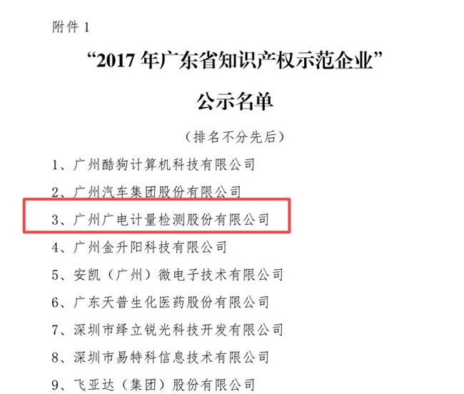 按照《廣東省知識產權示范企業和優勢企業評定辦法》(粵知保協發字〔2017〕17號),經企業自愿申請、各地市及順德區知識產權局擇優推薦、專家評審并由“廣東省知識產權示范企業和優勢企業評定工作指導委員會”合議,擬認定“廣州廣電計量檢測股份有限公司”等20家企業為“2017年度廣東省知識產權示范企業”。