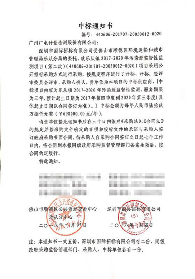 1月4日,佛山市順德區(qū)公共資源交易中心正式發(fā)布公告,廣電計(jì)量以總分第一中標(biāo)佛山市順德區(qū)環(huán)境運(yùn)輸和城市管理局樂(lè)從分局樂(lè)從鎮(zhèn)2017-2020年污染源監(jiān)督性監(jiān)測(cè)項(xiàng)目,服務(wù)期限為三年,合計(jì)中標(biāo)金額209.4萬(wàn)元。后續(xù),廣電計(jì)量將為工業(yè)大市佛山探索工業(yè)文明和生態(tài)文明協(xié)調(diào)發(fā)展,建設(shè)美麗村居,守護(hù)綠水青山獻(xiàn)策獻(xiàn)力。