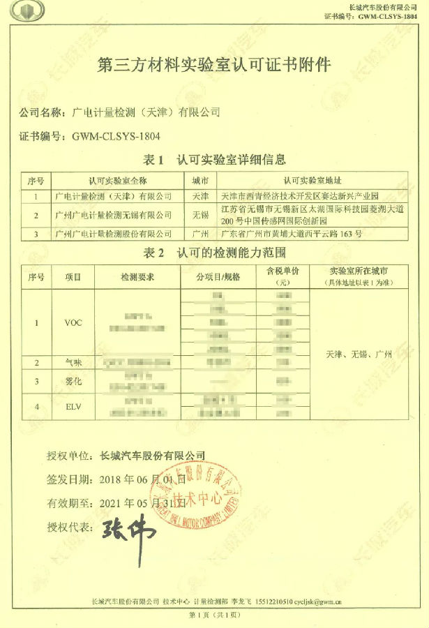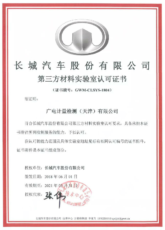 天津、無錫、廣州檢測基地新獲長城汽車第三方材料實驗室認可。至此,廣電計量已獲得長城汽車的化學分析(VOC、ELV、氣味、霧化)、電磁兼容檢測、可靠性與環境試驗(包括電氣性能)等多項授權認可。