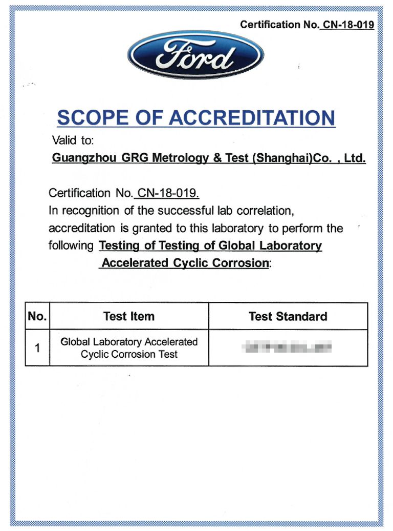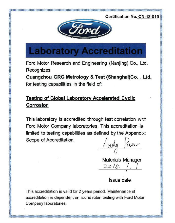 上海檢測基地新獲福特汽車循環腐蝕試驗第三方實驗室認可,今后可承接其供應商相關金屬類部件測試需求。此前,已有無錫檢測基地獲福特汽車第三方實驗室VOC(10L和2000L)認可。