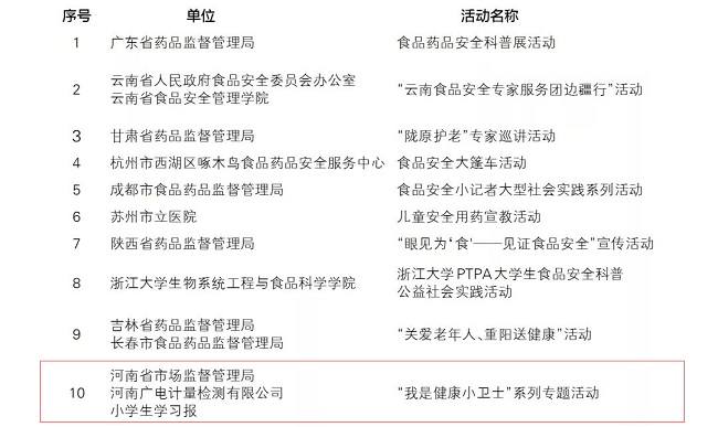 近日,原國(guó)家食品藥品監(jiān)管總局新聞宣傳司、中國(guó)健康傳媒集團(tuán)聯(lián)合組織的“全國(guó)食品藥品科普排行榜”獲獎(jiǎng)榜單正式發(fā)布。由河南省市場(chǎng)監(jiān)督管理局、河南廣電計(jì)量、小學(xué)生學(xué)習(xí)報(bào)聯(lián)合組織的“我是健康小衛(wèi)士”系列專題活動(dòng)榮獲“食藥科普十大傳播活動(dòng)獎(jiǎng)”。