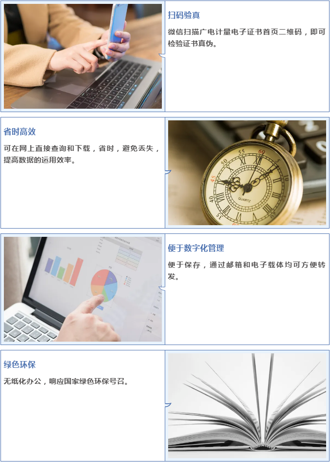 為便于客戶數(shù)據(jù)管理和查詢證書信息有效性,適應(yīng)“互聯(lián)網(wǎng)+計(jì)量”的逐步推廣以及計(jì)量檢測信息化的發(fā)展需要,廣電計(jì)量依靠自身信息化建設(shè)能力,全面推行電子證書,確保質(zhì)量信息真實(shí)、便捷、高效傳遞。今后,客戶可通過計(jì)量E管家、自助服務(wù)平臺(tái)、官網(wǎng)、公眾號(hào)等渠道自行查詢和下載使用,并可通過掃描證書二維碼查詢防偽信息。