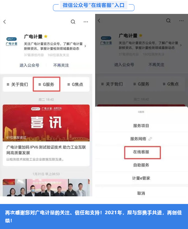 2、進一步優化客戶意見反饋體系。如果您在服務過程中有任何意見或疑問,您可通過官方電話、官方郵箱、官網及微信公眾號“在線客服”等各個渠道進行反饋,廣電計量將100%回復處理,切實保護您的利益。您的每一條意見和建議,都是我們不斷改進、提升客戶服務體驗的有益指導。