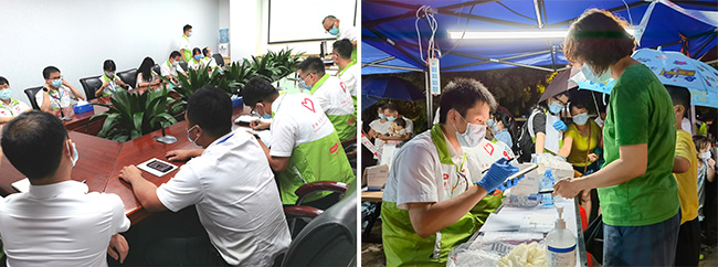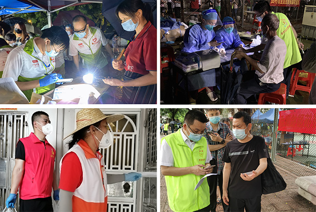 時而烈日當空,時而大雨傾盆,惡劣的天氣無疑大大增加了防疫工作的難度。廣電計量黨員和團員志愿者無懼烈日風雨,奔赴荔灣區、天河區的各個社區參與抗疫支援服務。他們有的負責維護現場秩序、有的負責引導檢測登記、有的負責為隔離居民送物資。