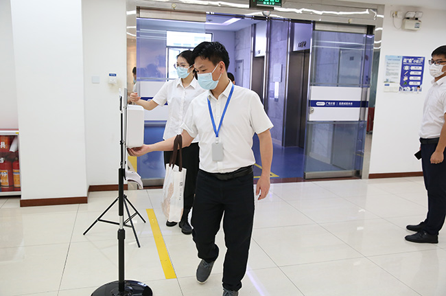 員工進入辦公區前進行測溫和消毒