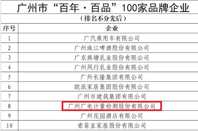 7月6日,廣州市質(zhì)量強(qiáng)市工作領(lǐng)導(dǎo)小組辦公室發(fā)布廣州市“百年·百品”企業(yè)名單,廣電計(jì)量憑借出色的綜合實(shí)力和良好的企業(yè)責(zé)任擔(dān)當(dāng),在近400家廣州本土品牌企業(yè)的角逐中脫穎而出,成功入選百?gòu)?qiáng)企業(yè)名單。