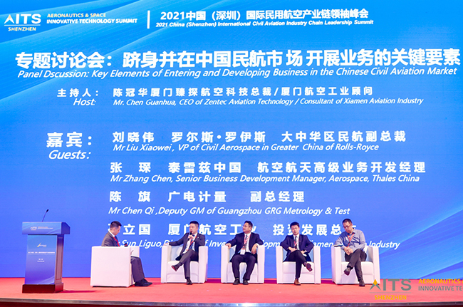 在產業鏈領袖峰會上的專題討論會環節,圍繞“躋身并在中國民航市場開展業務的關鍵要素”議題,陳旗、羅爾斯·羅伊斯大中華區民航副總裁劉曉偉、泰雷茲中國航空航天高級業務開發經理張琛、廈門航空工業投資發展總監孫立國等多位航空產業界代表分享交流,共同探討在國內民航市場蓬勃發展背景下,如何進行業務開拓的理論與實踐結合。