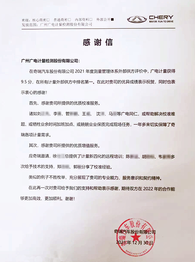 近日,廣電計量在奇瑞汽車股份有限公司(簡稱奇瑞汽車)2021年度測量管理體系外部供方評定中獲得總分第一名。奇瑞汽車發來感謝信,對廣電計量的專業技術能力、服務水平、契約精神給予高度認可。