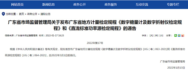 近日,廣東省市場監(jiān)督管理局發(fā)布公告,由廣電計(jì)量技術(shù)質(zhì)量部、計(jì)量研究院技術(shù)專家團(tuán)隊(duì)編寫的JJG(粵)064-2021《直流標(biāo)準(zhǔn)功率源檢定規(guī)程》正式發(fā)布,將于2022年3月1日起施行。