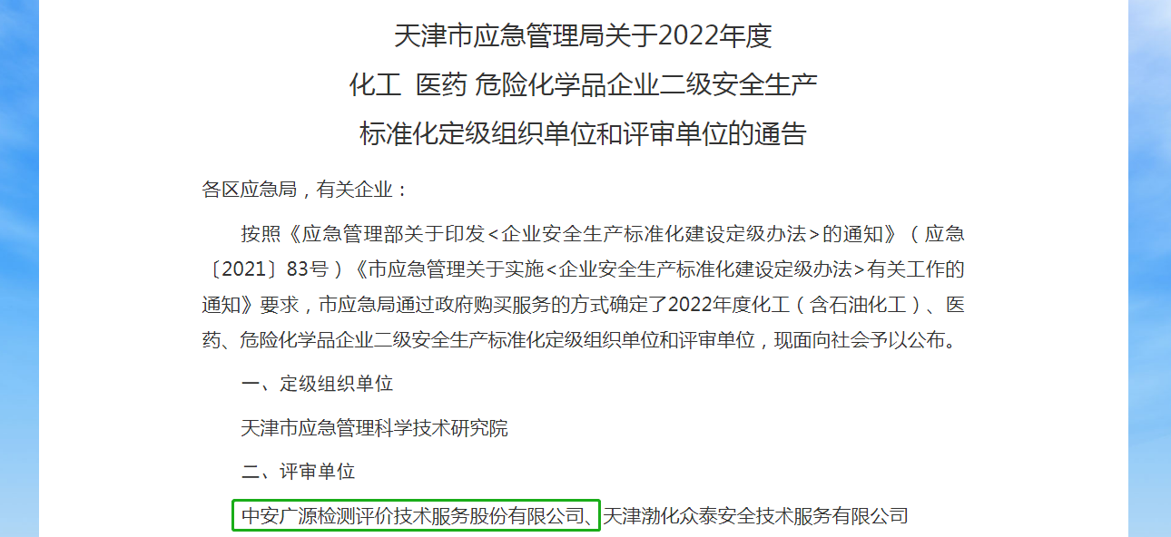 近日,天津市應急管理局印發了《2022年度化工、醫藥 、危險化學品企業二級安全生產標準化定級組織單位和評審單位的通告》,其中,廣電計量子公司中安廣源被確定為2022年度化工、醫藥 、危險化學品企業二級安全生產標準化評審單位。