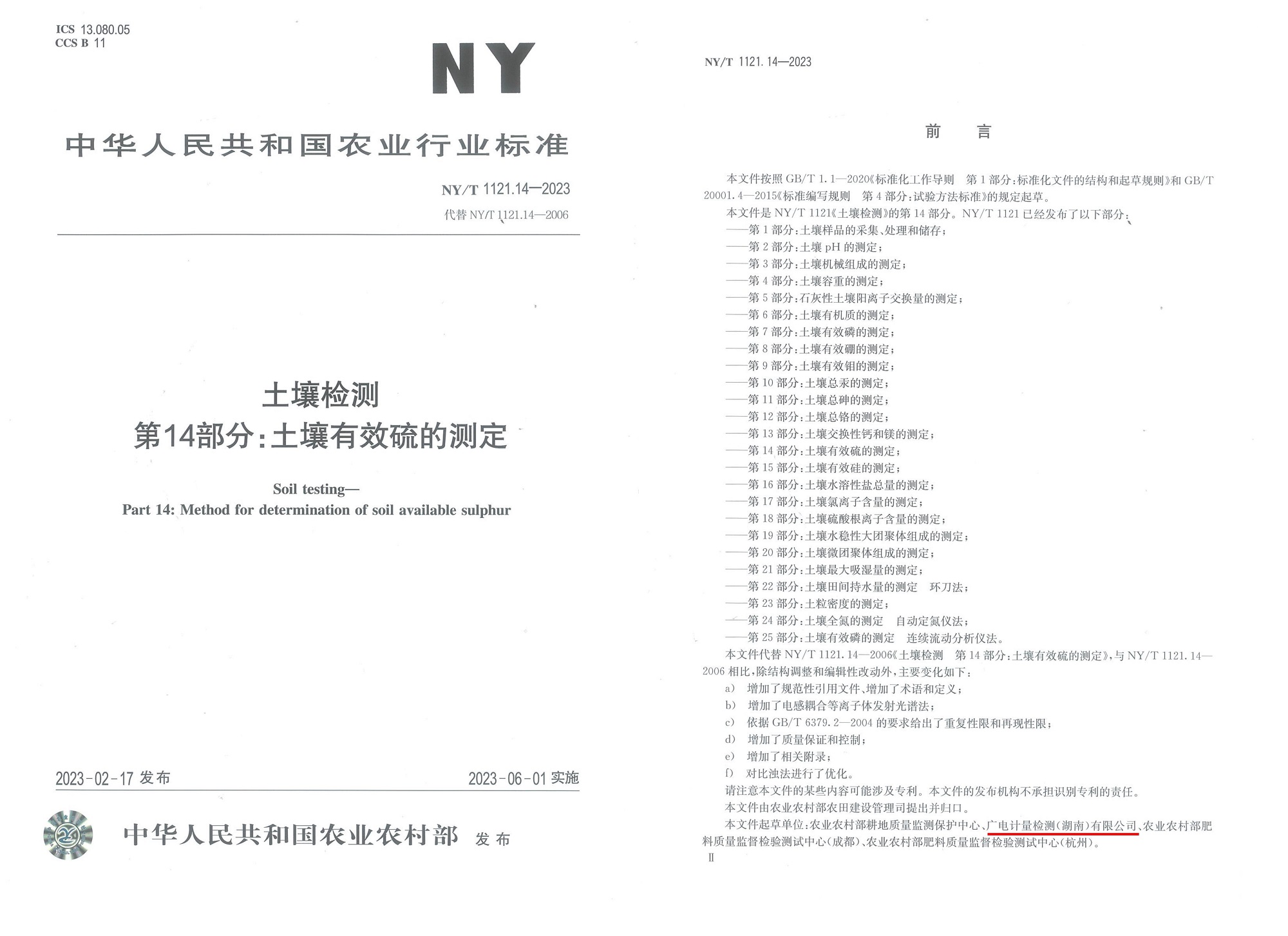 近日,農業農村部發布了中華人民共和國農業農村部公告第651號,《農作物種質資源庫操作技術規程 種質圃》等96項標準將于 2023年6月1日起實施。其中包括廣電計量檢測集團股份有限公司旗下子公司——河南廣電計量檢測有限公司、廣電計量(湖南)檢測有限公司參與起草的NY/T 1121.9—2023《土壤檢測 第9部分:土壤有效鉬的測定》和NY/T 1121.14—2023《土壤檢測 第14部分:土壤有效硫的測定》兩項行業標準。