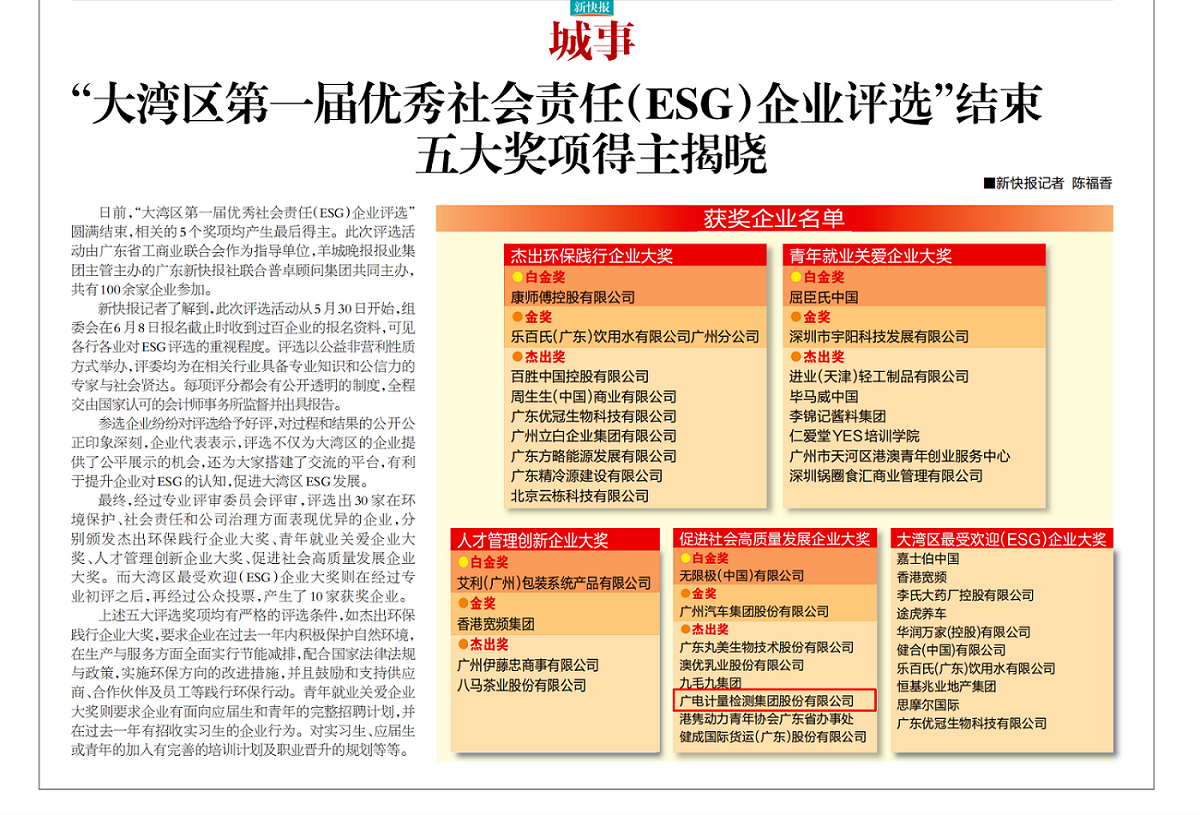 6月28日,由廣東省工商業聯合會指導,羊城晚報報業集團主管主辦,廣東新快報社、普卓顧問集團共同主辦的“大灣區第一屆優秀社會責任(ESG)企業評選”頒獎儀式在廣州舉行。憑借在產業布局、技術創新、環境保護和社會公益等方面的優異表現,廣電計量獲頒“促進社會高質量發展企業大獎杰出獎”,也是本次唯一入選的第三方計量檢測機構。