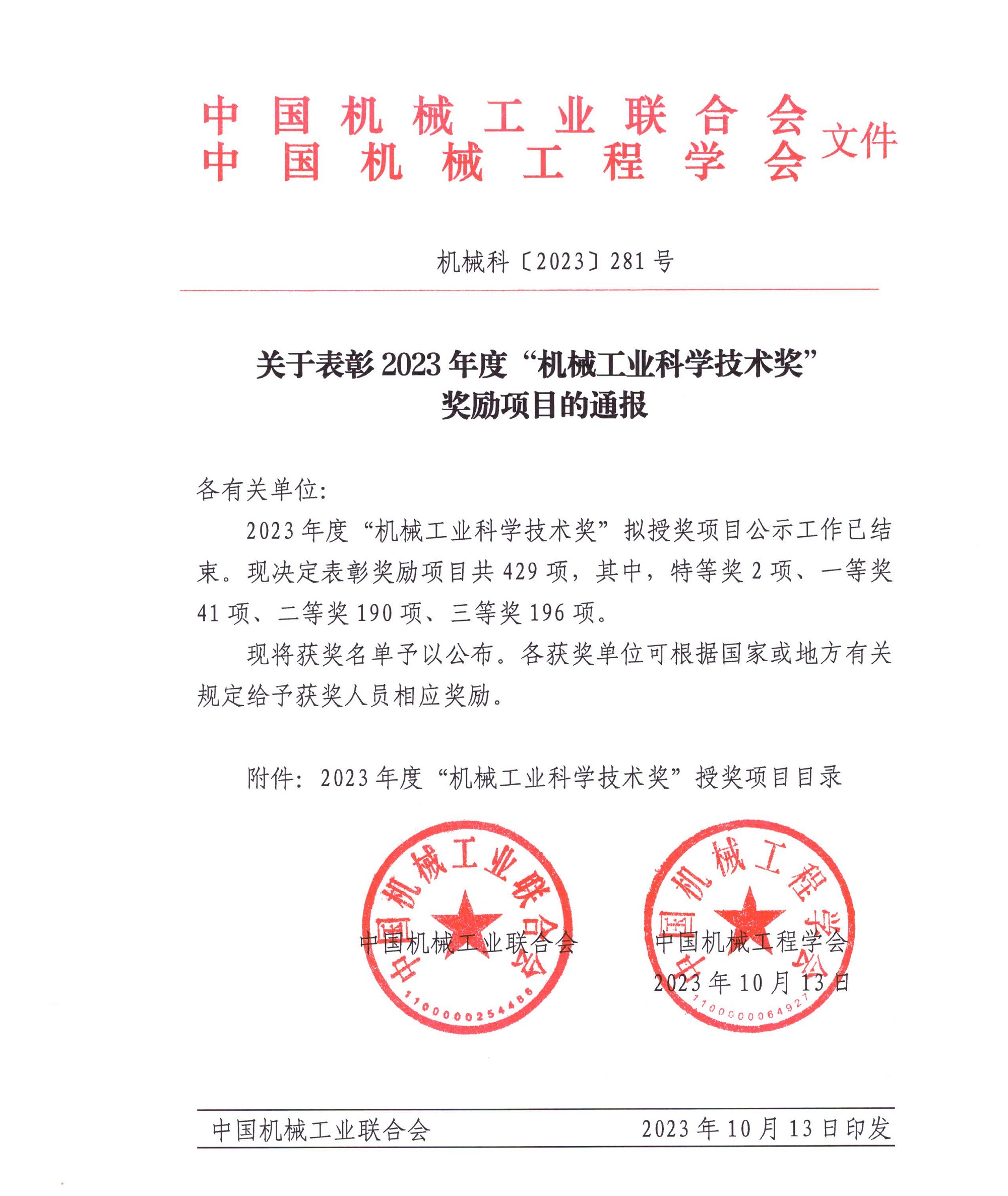 中國機(jī)械工業(yè)科學(xué)技術(shù)獎是根據(jù)《國家科學(xué)技術(shù)獎勵條例》和《社會力量設(shè)立科學(xué)技術(shù)獎管理辦法》的有關(guān)規(guī)定,由中國機(jī)械工業(yè)聯(lián)合會和中國機(jī)械工程學(xué)會共同設(shè)立并經(jīng)國家科學(xué)技術(shù)部批準(zhǔn),在國家科技獎勵主管部門登記的面向全國機(jī)械行業(yè)的綜合性科技獎項,也是機(jī)械工業(yè)申報國家科技進(jìn)步獎的主要渠道。