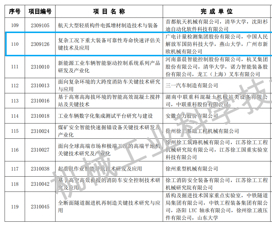 10月13日,2023年度“機(jī)械工業(yè)科學(xué)技術(shù)獎”名單公布。經(jīng)中國機(jī)械工業(yè)聯(lián)合會及中國機(jī)械工程學(xué)會評審,由廣電計量檢測集團(tuán)股份有限公司、國防科技大學(xué)、燕山大學(xué)和廣州市新歐機(jī)械有限公司聯(lián)合開發(fā)的《復(fù)雜工況下重大裝備可靠性壽命快速評估關(guān)鍵技術(shù)及應(yīng)用》項目獲評2023年度“機(jī)械工業(yè)科學(xué)技術(shù)獎”科技進(jìn)步獎二等獎。