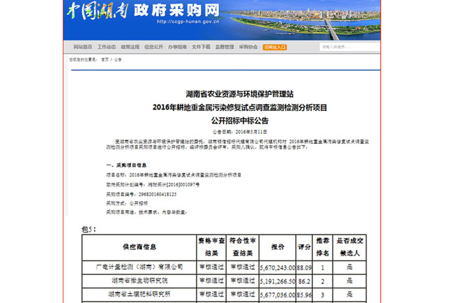 資訊中心公司新聞廣電計(jì)量中標(biāo)湖南省農(nóng)業(yè)廳2016年耕地重金屬污染修復(fù)試點(diǎn)調(diào)查監(jiān)測檢測分析項(xiàng)目