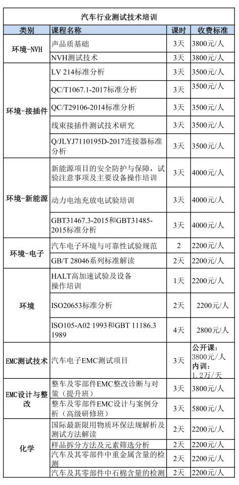 課程體系主要涵蓋:汽車行業(yè)的環(huán)境可靠性檢驗技術(包括:環(huán)境-NVH、環(huán)境-接插件、環(huán)境-電子等)、EMC檢測(包括:EMC測試技術、EMC設計基整改等)、化學檢測等多個類別。