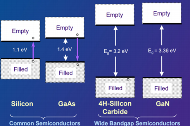 上圖體現了第一代、第二代、第三代半導體之間禁帶寬度的差異--第三代半導體的禁帶寬度幾乎是前面兩者的3倍。這為第三代半導體帶來許多優勢,簡單來講就是第三代半導體器件有“三高”:高頻率、高功率、高耐溫。同時第三代半導體在應用上能夠降低能耗、減小體積、減小重量,簡單來說是有三低:能耗低、體積小、重量輕。