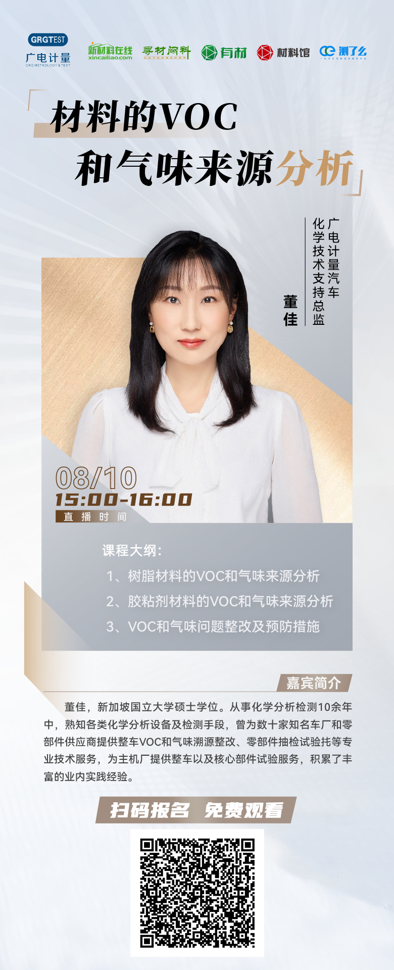 VOC(揮發(fā)性有機(jī)物)和氣味污染主要來源于產(chǎn)品生產(chǎn)過程中的原材料和添加劑,這些原料會釋放出一定量甲醛、乙醛、甲苯等有害氣體和物質(zhì)。VOC含量一旦超標(biāo),不僅會產(chǎn)生難聞的氣味,還會對消費(fèi)者的身體健康造成危害。在材料研發(fā)和生產(chǎn)過程中做好材料的VOC測試和氣味溯源分析,有利于實現(xiàn)綠色材料升級,獲得更廣泛的市場認(rèn)可。為此,廣電計量與尋材問料將聯(lián)合舉辦《材料的VOC和氣味來源分析》線上公開課,為企業(yè)提供材料VOC和氣味問題的整改及預(yù)防建議,邀您參與觀看。