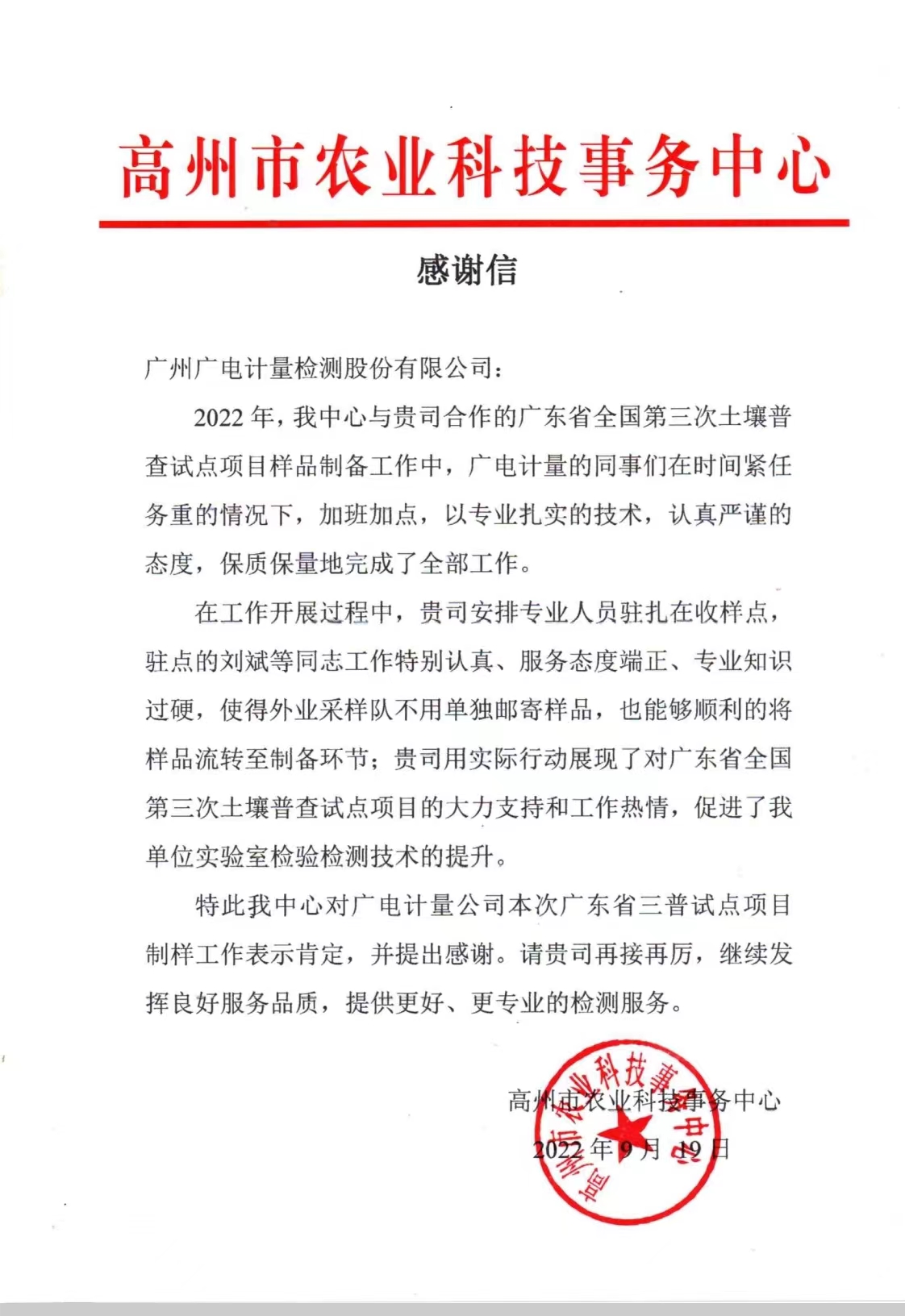 近期,各地第三次全國土壤普查試點工作正陸續啟動。由廣州廣電計量檢測股份有限公司(股票簡稱∶廣電計量,股票代碼:002967)承擔的廣東省高州市第三次全國土壤普查試點縣項目,收到了來自高州市農業科技事務中心的感謝信。高州市農業科技事務中心對廣電計量項目中展現的良好服務品質和取得的卓越成效給與了充分肯定,另外對工作人員不畏艱難、兢兢業業的工作精神給予了高度贊揚。
