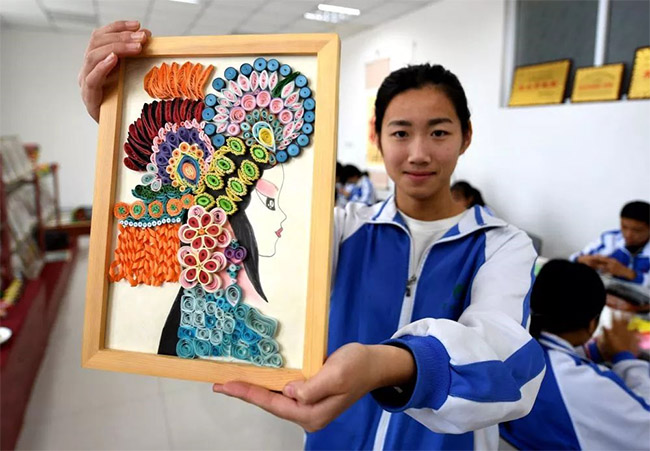 2018年11月16日,河北衡水冀州職教中心學(xué)生展示制作的衍紙作品。