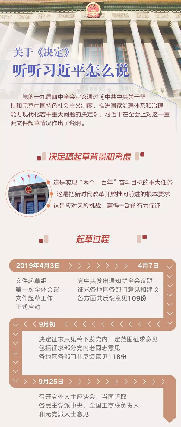 文件起草組成立6個多月來,認真研讀相關(guān)重要文獻,系統(tǒng)總結(jié)我國革命、建設(shè)、改革進程中的制度演變、制度創(chuàng)新,特別是深入總結(jié)黨的十八大以來黨中央領(lǐng)導全黨全國人民堅持和完善中國特色社會主義制度,推進國家治理體系和治理能力現(xiàn)代化取得的重大理論成果、實踐成果、制度成果,整理消化各方面反饋的意見和建議,開展專題研究,反復討論修改決定稿。