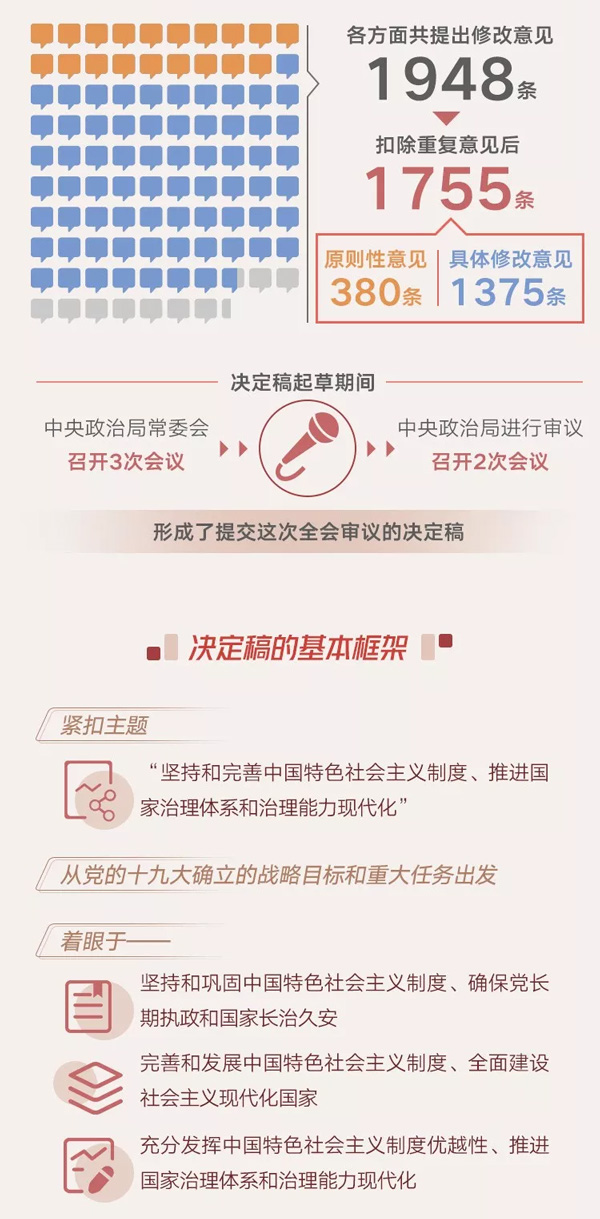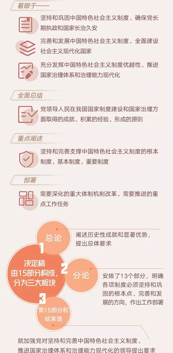 決定稿總體考慮是,緊扣“堅持和完善中國特色社會主義制度、推進國家治理體系和治理能力現(xiàn)代化”這個主題,從黨的十九大確立的戰(zhàn)略目標和重大任務出發(fā),著眼于堅持和鞏固中國特色社會主義制度、確保黨長期執(zhí)政和國家長治久安,著眼于完善和發(fā)展中國特色社會主義制度、全面建設(shè)社會主義現(xiàn)代化國家,著眼于充分發(fā)揮中國特色社會主義制度優(yōu)越性、推進國家治理體系和治理能力現(xiàn)代化,全面總結(jié)黨領(lǐng)導人民在我國國家制度建設(shè)和國家治理方面取得的成就、積累的經(jīng)驗、形成的原則,重點闡述堅持和完善支撐中國特色社會主義制度的根本制度、基本制度、重要制度,部署需要深化的重大體制機制改革、需要推進的重點工作任務。
