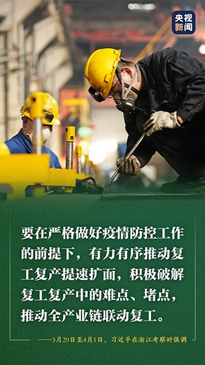 習(xí)近平總書記指出,要有力有序推動復(fù)工復(fù)產(chǎn)提速擴(kuò)面,積極破解復(fù)工復(fù)產(chǎn)中的難點(diǎn)、堵點(diǎn),推動全產(chǎn)業(yè)鏈聯(lián)動復(fù)工。