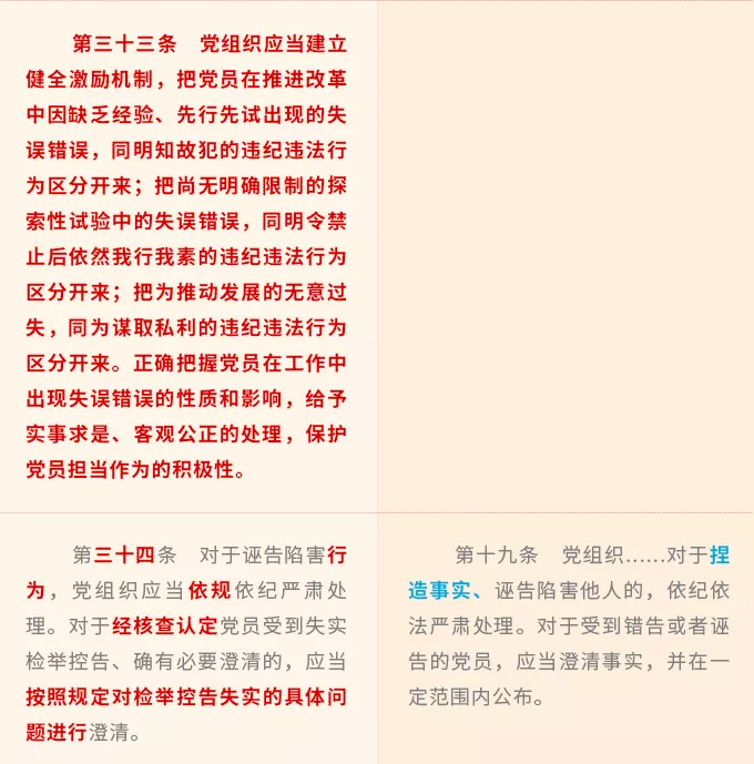 總結(jié)有關(guān)經(jīng)驗做法和創(chuàng)新性制度,新增了系列保障措施。比如,第二十五條規(guī)定的創(chuàng)新方法手段,第二十八條規(guī)定的健全黨代表、領(lǐng)導干部聯(lián)系黨員制度,第三十三條規(guī)定的落實“三個區(qū)分開來”要求等。