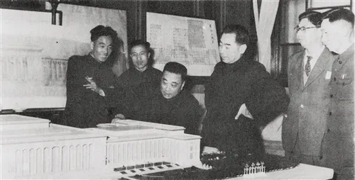 原北京市規劃管理局設計院總建筑師張镈為周恩來總理講解人民大會堂方案。