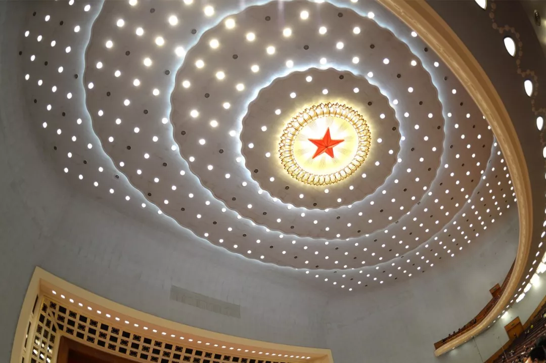 在大會堂施工過程中,有人提出,萬人大禮堂層高過高,顯得人很渺小,但觀眾席的兩層挑臺又使人感到壓抑。這個看似矛盾的技術難題被周總理用一句王勃的名句點破:“落霞與孤鶩齊飛,秋水共長天一色。”在周總理的啟發下,設計師把頂棚做成象征天體空間的大穹隆形,與墻身交接處則由直線改為圓角,形成了渾然一體的效果。穹頂上,三層水波形的暗燈槽圍繞著紅五角星,500個燈孔點綴其間,觀眾一抬頭就可見繁星點點,絲毫不會感到生硬和壓抑。