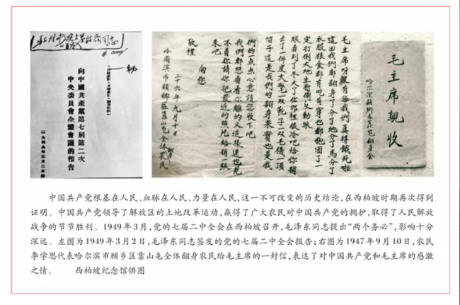 ——彰顯為了人民、依靠人民的人民情懷。中國(guó)共產(chǎn)黨根基在人民、血脈在人民、力量在人民。展覽中展示了這樣一封書(shū)信,信中寫(xiě)道:“毛主席呀,沒(méi)有您我們真得餓死啦。這回我們都翻身了,分了地,分了馬,分了衣服、糧食,都有吃有穿,也都抱團(tuán)了……”這封信是東北翻身農(nóng)民寫(xiě)給毛主席的,已經(jīng)成為我們黨一切為了人民、一切依靠人民的歷史見(jiàn)證。全國(guó)土地會(huì)議景觀、參加全國(guó)土地會(huì)議的部分人員名單、部分代表在土地會(huì)議上的發(fā)言稿、老農(nóng)民在土墻上書(shū)寫(xiě)的《中國(guó)土地法大綱》照片、“土地回老家”錦旗……眾多展品生動(dòng)詮釋了黨在西柏坡的歷史,就是全心全意為人民服務(wù)的歷史。支前民工的立功喜報(bào),用過(guò)的推車(chē)、紡線(xiàn)車(chē),“運(yùn)糧先鋒”的獎(jiǎng)旗……人民群眾踴躍參軍參戰(zhàn)、繳糧支前,為人民軍隊(duì)提供了源源不斷的人力物力,大大加快了解放戰(zhàn)爭(zhēng)勝利和新中國(guó)建立的步伐。黨為了人民、依靠人民的文物、史料和真實(shí)記錄,可以啟迪干部群眾深切感受到,黨始終堅(jiān)持全心全意為人民服務(wù)的根本宗旨,人民群眾的擁護(hù)和支持是我們黨最堅(jiān)實(shí)的根基。