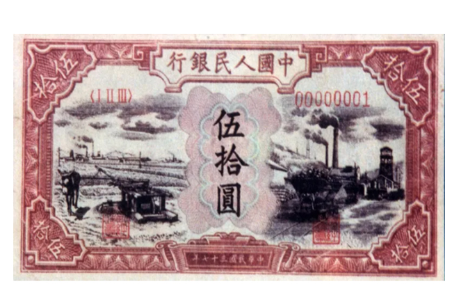 1948年12月1日,中國(guó)人民銀行發(fā)行第一套人民幣,“中國(guó)人民銀行”六個(gè)字由當(dāng)時(shí)的華北人民政府主席董必武同志題寫(xiě)。第一批發(fā)行的人民幣有10元、20元和50元三種券別,首先在華北、山東和西北三大解放區(qū)流通使用。圖為50元一號(hào)人民幣。西柏坡紀(jì)念館供圖