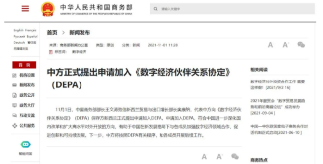 11月1日,商務部部長王文濤致信新西蘭貿易與出口增長部長奧康納,代表中方向《數字經濟伙伴關系協定》(DEPA)保存方新西蘭正式提出申請加入DEPA。